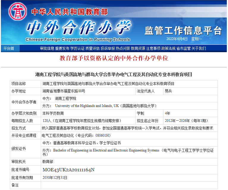 --2011年,与英国高地与群岛大学合作举办电气工程及其自动化专业,是湖南省第一批获得教育部批准的本科中外合作办学项目