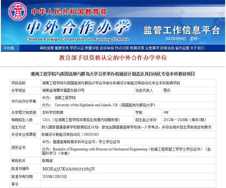 --2012年,获批与英国高地与群岛大学合作举办机械设计制造及其自动化专业本科教育项目