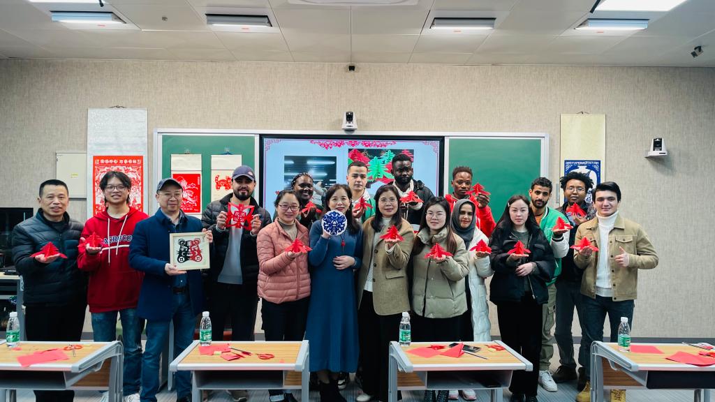 新学期伊始,课程组特邀株洲市非物质文化遗产传承人、湖南省剪纸研究会理事李伟静老师来到课堂,将中华优秀传统剪纸艺术带进校园。李老师深入浅出地介绍剪纸艺术的历史渊源、种类形式、民间剪纸地域特点,重点阐述了剪纸创作方法,并带领留学生亲手体验了“纸上飞花”的艺术之美。立体“春”字的剪纸体验更是对留学生 “一年之计在于春”的殷切勉励,鼓励他们珍惜时光,勇做时代追梦人。